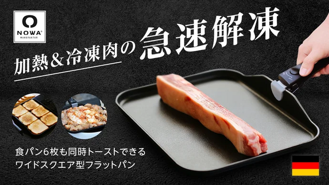 日本未上陸のドイツブランド「NOWA WIDE FLAT PAN」。熱伝導率が高いので、スピーディに加熱&冷凍肉の急速解凍もOK!