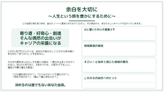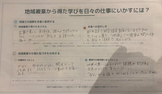地域複業ノートに設計されたワークでは、日常と非日常の越境体験から再現性のある学びを得ます。(記入実例)