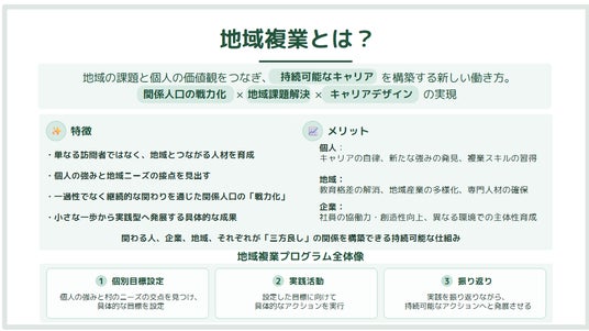 開催前にテーマを定め、開催中は現地体験を通じて解像度を高め、開催後は実行計画へ落とし込むことで、自分に合った「地域複業=持続可能なキャリアデザイン」を具体化します。