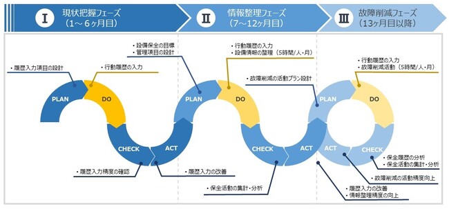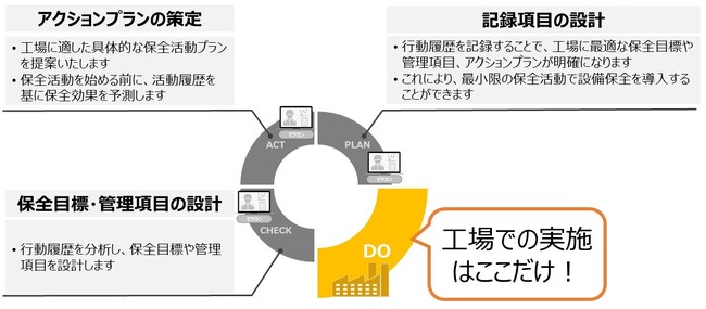 この新しいサービスは、製造現場の担当者が行動履歴を付けるだけで、設備保全の導入ができるサービスです。「セツカン」サービスを利用して行動履歴の情報を蓄積し、その情報をもとに設備保全のエキスパートが工場に適正な保全目標や管理項目、アクションプランを明確にします。現在、専門部員がいない製造現場にも、ムリなく、ムダなく、生産を安定させるための設備保全業務が導入できます。