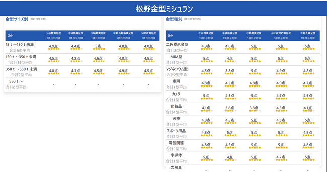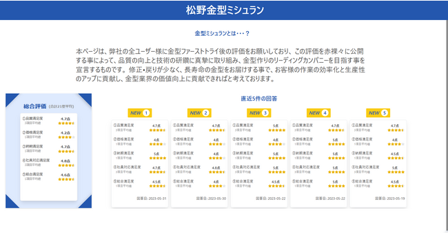 評価は(1)品質満足度、(2)価格満足度、(3)納期満足度、(4)社員対応満足度、(5)総合満足度、という5項目からなり、各項目は5点満点で評価されます。サイトでは直近5件の評価が閲覧できるほか、過去すべての評価から算出された総合評価、金型サイズ別評価、金型種別による評価が掲載されています。