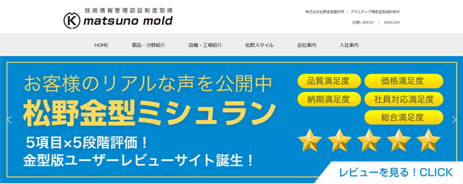 金型の設計・製造・販売を行う株式会社松野金型製作所(本社:佐賀県三養基郡基山町、会長:松野行秀、社長:梅田勉 以下「当社」)は、自社製品に対する発注元からのリアルな評価をインターネット上で一般公開するB to B向けカスタマーレビューサイト「金型ミシュラン」をこのたび公開しました。金型ミシュランは、安心できる発注先を探したい企業での活用・貢献が期待されています。当社は金型ミシュランを通じて従来以上に発注元の声を真摯に受け止め、品質の向上と技術の研鑽に取り組んでいきます。