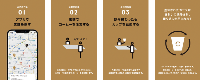 ユーザーは専用のスマートフォンアプリをダウンロードしてCUPLESを利用できるショップを確認します。お店で注文の際に「カプレスで」と伝えてください。コーヒーを飲み終わったらカップをお店に返却します。カップのやユーザー利用状況の管理は利用時・返却時にアプリでQRコードを読み取るだけでできるので、気軽に利用することができます