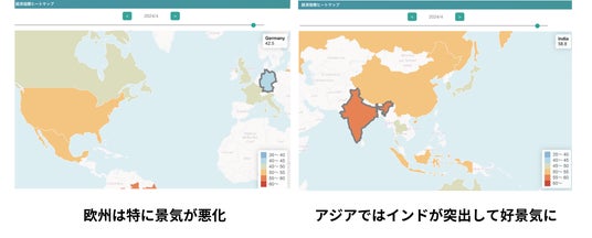 3年後の2024年には欧米の景気上昇は収まり、逆に欧州が反動で景気後退。ドイツは42.5までPMIが下がりヒートマップが青くなってしまいました。