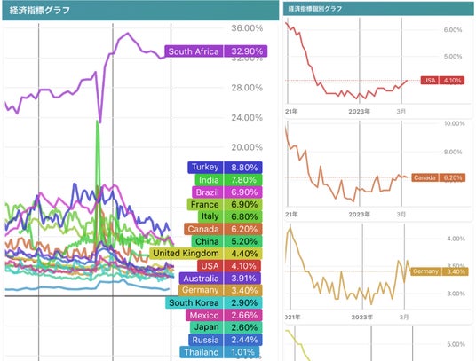 インフレ率・GDP・失業率など主要国での動き・地域差をいち早く把握可能です