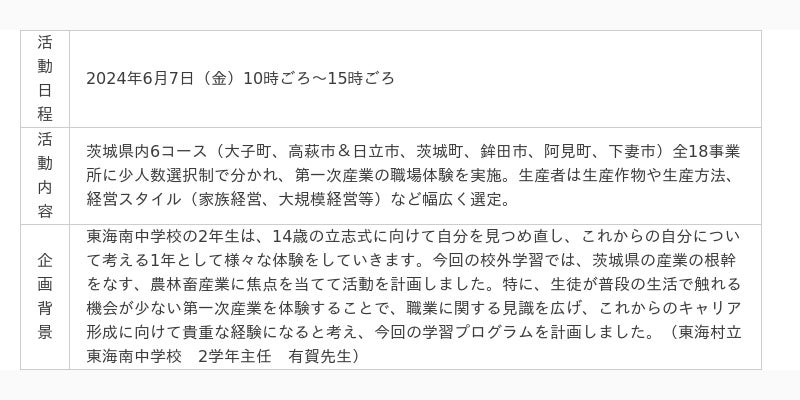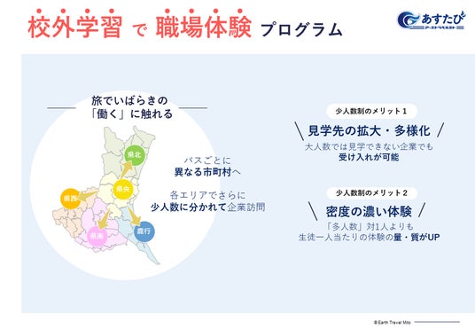 アーストラベル水戸(株)(本社:茨城県水戸市、代表:尾崎精彦)は中学生を対象に、地域に根付いた産業の体験を盛り込んだ職場体験型校外学習プログラム(以下、本プログラム)をスタートいたします。本プログラムではバスごとにコースを設定。各コース茨城を代表する地域事業者のもとを少人数選択制で訪問し、職場体験を行います。コロナの影響により職場体験受入れ先が減少し、教員の負担が増えている現状を改善しつつ、地域の仕事や大人に触れることでシビックプライドを醸成し、将来の職業選択につながるきっかけを提供することを目指しています。