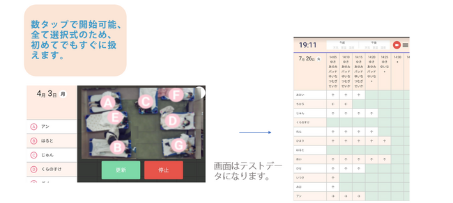 最短4タップで画面に映る赤ちゃんの画像と名前を紐づけ可能。午睡の手間が一気に減少します。