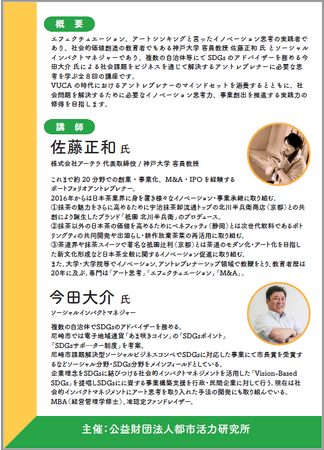 エフェクチュエーション、アートシンキングといったイノベーション思考の実践者であり、社会的価値創造の教育者でもある神戸大学 客員教授 佐藤正和 氏と、ソーシャルインパクトマネジャーであり、複数の自治体等にてSDGsのアドバイザーを務める今田大介氏による社会課題をビジネスを通じて解決するアントレプレナーに必要な思考を学ぶ全8回の講座です。