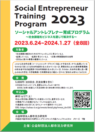 2023年6月24日~2024年1月27日まで全8回で社会課題をビジネスで解決することを目指す「ソーシャルアントレプレナー育成プログラム2023」をグランフロント大阪にて開講します。