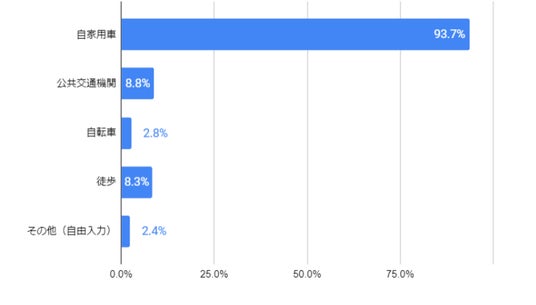 タクシー、ハイヤーを含む公共交通機関を日常で利用している人は1割にも満たなく、93.7%が自家用車を日常利用していた。