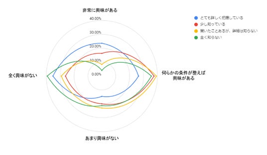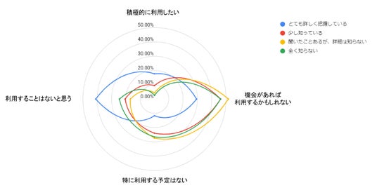 日本版ライドシェアについての認知が高いほど利用に関心がある人が増えている一方、とても詳しく把握している人は「利用することはないと思う」の回答が40%を超えている(レーダーチャート)。