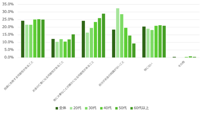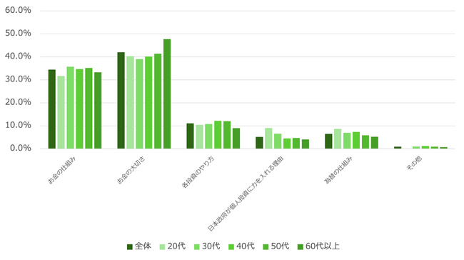 「他に大事なことが疎かになる可能性があること」に関しては、20代が16.5%、30代が19.5%、と回答者の年齢があがるにつれ高いポイントを獲得、世代別で最も高かったのは60代以上で28.9%でした。逆に「自分がお金の知識がないこと」については、10代32.5%、20代28.6%、・・・・と、年代があがるにつれポイントは下がり、最も少なかったのは60代以上で9.3%でした。