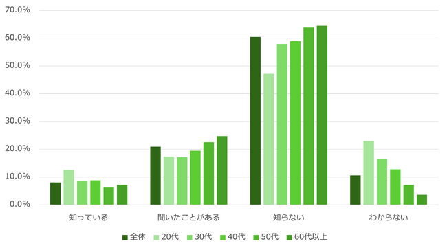 はじめに、投資・お金の教育に取り組んでいる学校があることを知っているか聞いたところ、「知っている」と回答したのは僅か8%、「聞いたことがある」との回答も20.9%にとどまり、一方「知らない」という回答は6割にのぼりました。年代別に見ると、回答に大きくばらつきはないものの、20代は「知っている」との回答が他年代と比べ多く、同様に「知らない」との回答は他年代よりも少ないことがわかりました。