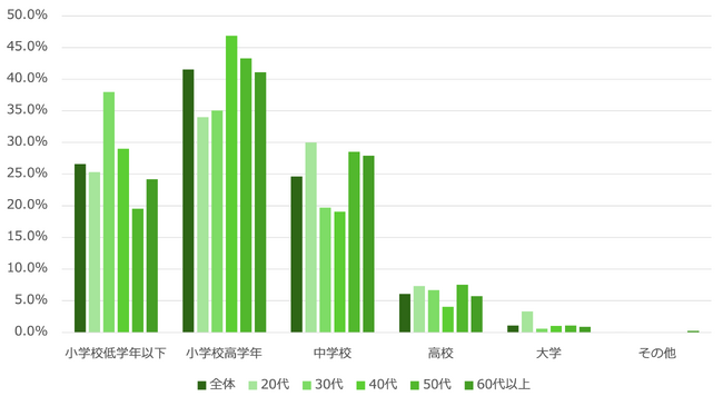 次に、前の質問で「学校での投資・お金の教育」は必要であると回答した方へ、いつからはじめるべきか聞いたところ、最も多かったのは「小学校高学年」で41.5%、つづいて「小学校低学年以下」で26.6%でした。両者を合わせると7割近い方が、「小学校」からく投資・お金の教育をはじめるべきだと考えていることがわかりました。
