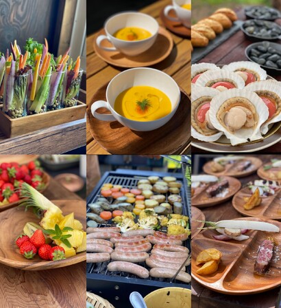 料理は本場フランスの3つ星レストランで修業後、国内5つ星ホテルの総料理長を歴任し、またハンターでもある飯島豪シェフ監修のフレンチスタイルの本格的BBQ料理。地産地消をテーマに厳選された旬な地元食材を使用しメインは鹿肉のジビエ料理となります。