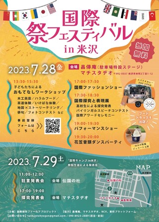 国際探究フィールドプロジェクトの一環として、日本国内の難民と外国籍の日本語学習者、そして、米沢の人々と人材の交流の場として祭として企画。招待された難民の子ども達や日本語学習者達は祭の参加者として楽しむだけでなく、午後にはワークショップを提供するスタッフとして、米沢の地域の方々をもてなす。また、夜にはそれぞれの持つルーツを服装で表現する国際ファッションショーを開催。ファッション服を通して文化を体感することで、身近な国際理解の機会を提供する。合わせて、バイリンガルスピーチコンテストも開催し、日本語と英語それぞれのネイティブスピーカーが、自身の探究活動とその表現について、スピーチを行う。祭のクライマックス最後には、山形県の地域に根付く花笠音頭をベースにしたダンスパーティーや音楽・演劇のパフォーマンスも行われる。