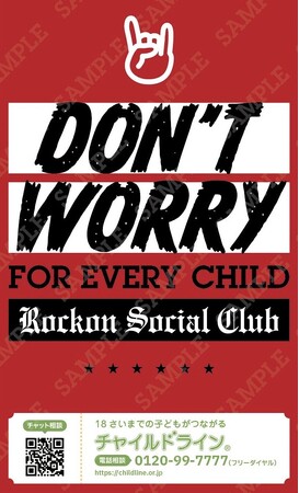 本日より、Rockon Social Club公式グッズ通販サイトで「DON'T WORRY」のオリジナルチャリティステッカーを販売。支援先として「子どもの声を聴き、気持ちを受けとめる活動」を行う「チャイルドライン」にご協力をいただき、ステッカーの売上をチャイルドラインに寄付することで、子どもたちの心の支援を目指します。