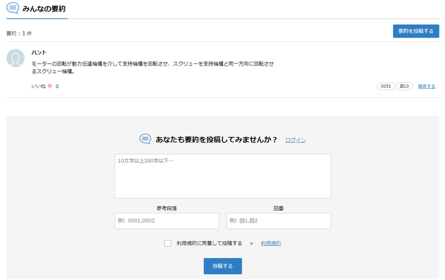 これに対して、「Patepedia」の「AI要約」、ユーザーの皆様から投稿される「みんなの要約」は150字程度のものとし、その特許発明がどのような特許発明かをより理解しやすくなっています。