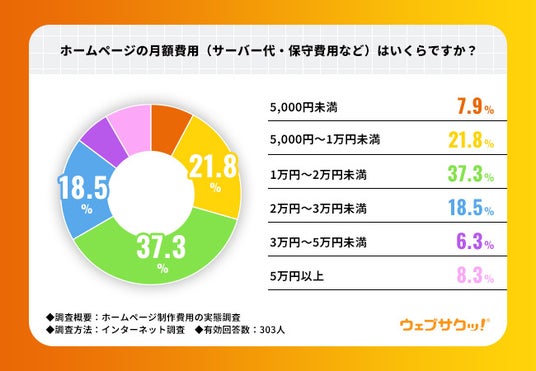 「ホームページの月額費用(サーバー代・保守費用など)はいくらですか?」と質問したところ、『1万円~2万円未満』が37.3%で最多となりました。次いで『5,000円~1万円未満』が21.8%、『2万円~3万円未満』が18.5%と続きました。