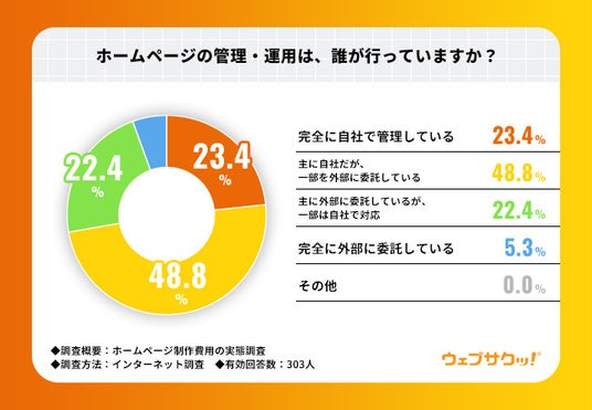 そこで「ホームページの管理・運用は、誰が行っていますか?」と質問したところ、『主に自社だが、一部を外部に委託している』が48.8%で最多となりました。次いで『完全に自社で管理している』が23.4%、『主に外部に委託しているが、一部は自社で対応』が22.4%と続きました。