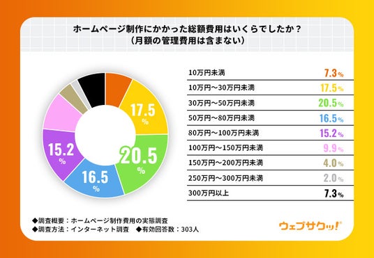 東京都渋谷区を拠点に、ホームページ作成の格安サービス「ウェブサクッ!」(https://www.hifactory.net/)を運営する株式会社ハイファクトリ(所在地:東京都渋谷区、https://www.hifactory.co.jp/)は、過去5年以内に外部に依頼して自社のホームページを制作・リニューアルした全国20~50代の男女303名を対象に、「ホームページ作成費用の実態調査」を実施しました。