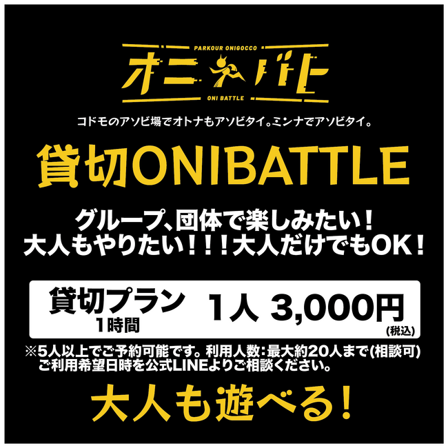 20秒間に1体1で鬼ごっこを行う、究極の鬼ごっこと言われるパルクール鬼ごっこ施設が8月にオープン致しました。大人でもやってみたいという声を多く頂きこの度、大人/団体様向けプラン受付を開始!