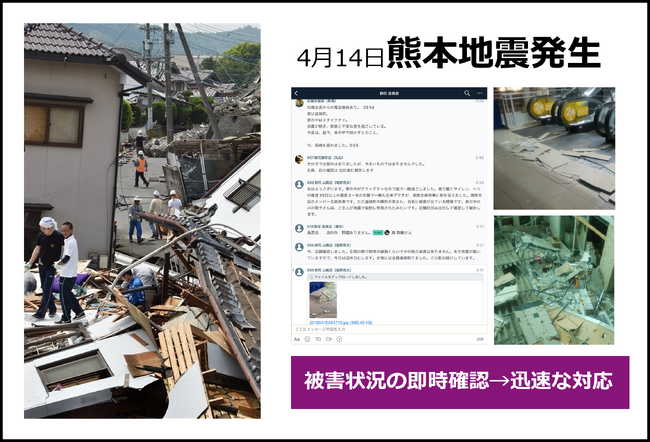 その後、2016年に熊本地震が発生。その時に被災地にある店舗とのやり取りで活躍したのが、このチャットワークでした。現地の状況を短いコメントと画像で確認し、迅速な対応を取ることができました。