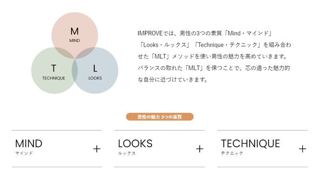 IMPROVEは内面と外見の両方から男性の魅力を高めていくプログラムです。プログラムは3つの素質「Mind・マインド」「Looks・ルックス」「Technique・テクニック」を組み合わせた「MLT」メソッドを使います。