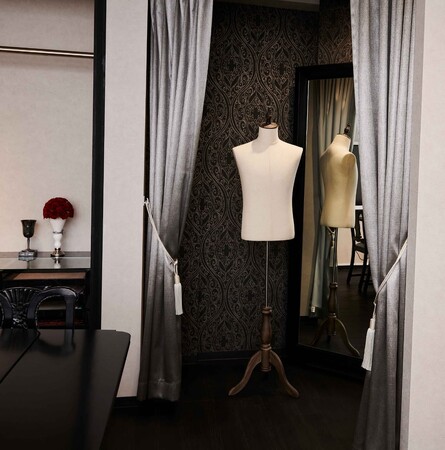 「見た目」だけでなくマインドを高め整えていけるドレッシングルームを銀座にてご用意しています。テーマは“男性の支度部屋”。ファッションやヘアメイクを整えて自分の新しい扉を開く黒と白を基調にしたクラシックモダンな空間。家具や照明は本物のアンティークをカスタマイズしたもの。
