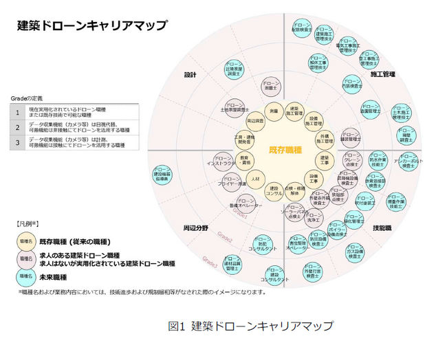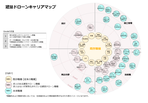 ・マップ中央に「既存職種」を配置し、該当エリアに「求人のある建築ドローン職種・求人はないが実用化されている建築ドローン職種」「未来職種」を、関係性がわかるように配置