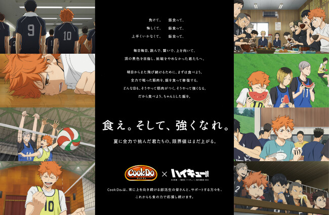 ビジュアルは人気アニメ「ハイキュー!!」より、主人公が所属する烏野高校排球部のメンバーが登場するカットを使用。主人公たちが試合に敗北し、寮で悔し涙とともに食事を噛み締めるシーンや、合宿先での過酷な練習の合間に体力を蓄えるため食事を頬張るシーンなど、夏の大会に挑んだ部活生にとって共感できるカットとともに、作中でも度々触れられる「食べることの重要性」に焦点を当てた「Cook Do(R)」からの応援メッセージを伝えます。