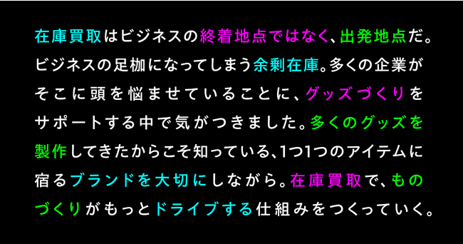 サプライチェーンのDXが急速に進み、ブランド立ち上げのハードルが下がり、ものづくりの民主化が起こりました。そんな中、私たちはグッズ製造から流通や販売のサポートをするうちに、余剰在庫によってビジネスが止まってしまう瞬間があることに気がついたのです。グッズづくりのプロフェッショナルだからこそ、在庫の最適化までおこなうことで、余剰在庫が事業を進める足枷にならないように。『HIKIFUDA KAITORI』によって、倉庫を空けたりキャッシュフローの改善をおこなうことが、みなさまのビジネスの未来を切り拓くトリガーであると確信しています。