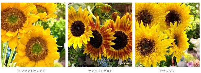 切花ヒマワリの魅力は品種の多さ。今回は明るく華やかな「ビンセントオレンジ」、落ち着いたブラウンタイプの「サンリッチマロン」、個性豊かな八重咲の「パナッシェ」が入荷します。1本からブーケまでお客様のご希望に応じて販売します。