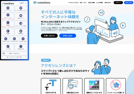 アクセシレンズの導入により、テキストの読み上げや文字の拡大、色彩の調節他、様々な機能がウェブサイトに実装可能です。「JIS X8341-3:2016」の適合レベルAAおよび欧米のWCAG、ADAの規格に準拠するよう開発されたツールとなります。販売価格 税別 月額9,800円(1年契約)