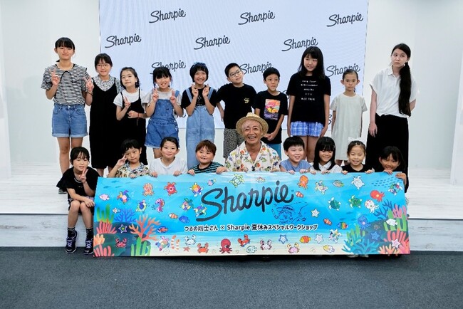 後半では、つるの剛士さんと参加者全員でひとつの作品を仕上げていくワークショップも実施。参加者たちが、海の生物の切り絵に色を塗り、それを縦70cm、横270cmの大きな海の絵に貼りつけていき、海の中を泳ぐ生き物の群れを完成させ、つるの剛士さんがサインを入れて、全員で記念撮影。子どもたちといっしょに楽しんだつるの剛士さんは「Sharpieのようなカラフルな人生を!」と伝え、“Sharpieで描いた夏の思い出”を閉会しました。