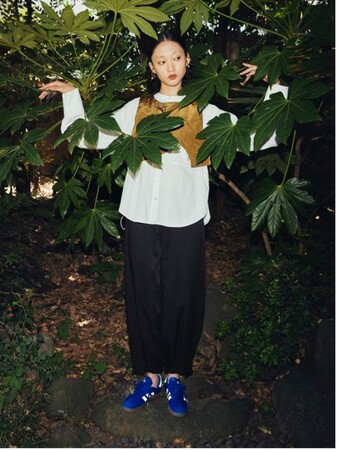 ブランドのアイデンティティーとなるサークルディティールを取り入れた中綿ベストと、たっぷりとタックを入れたコクーンパンツはスタンダードなアイテムながら動きのある佇まいを楽しめます。