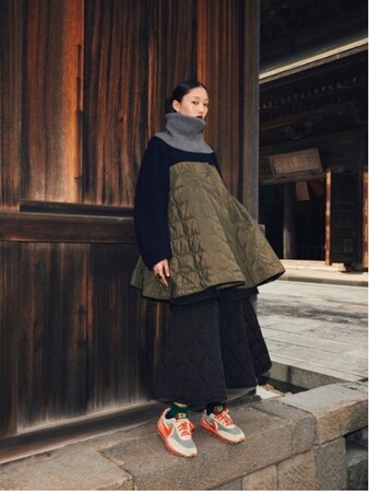ウールコートにキルティング素材をドッキングしたコートは構築的で計算し尽くされたフレアーパターンでカジュアルながらもモードな雰囲気に。