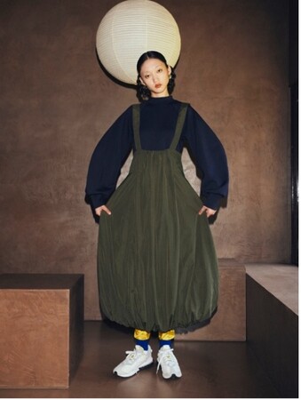 中綿キルティング素材をバルーンシルエットに仕上げたワンピースは、