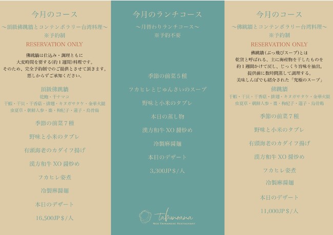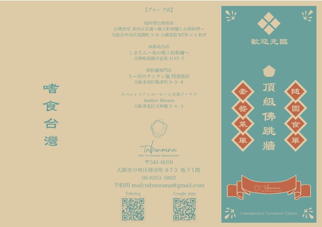 (所在地:大阪市中央区、代表:田淵雅圭(台湾名:潘圭眞))は、「台灣食堂南船場本店」をリニューアルし、佛跳牆と近代台湾料理を提供するNeo Taiwanese Restaurant「tabunoana」を開業します。