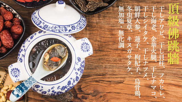 乾鮑・干海參・干貝柱・干蝦・干椎茸などの乾貨をふんだんに使用し、冬虫夏草・高麗人参・キヌガサタケ・烏骨鶏・金華火腿などの食材を合わせた中華料理史上、最高のスープ。福建省が発祥と言われるこの料理は、台湾に渡った福建の方々により伝えられ、台湾内でも人気のスープです。