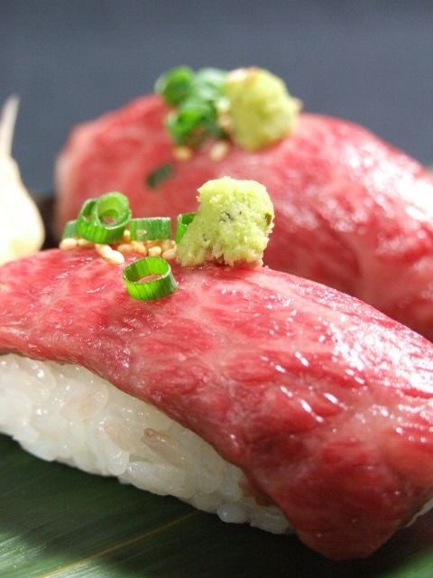 海外にも人気な寿司を牛肉でも。程良いサシが入ったタテバラ肉は酢飯と相性抜群。何個でも食べられてしまう美味しさ。