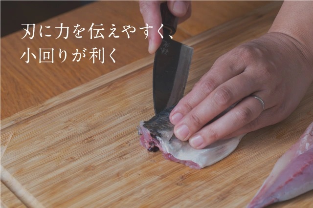 バランスの良さと使いやすさに細部までこだわった造形。イカや魚の腹を素早く綺麗に開くため、刃の左右が同じ形の「両刃」造り。両刃なので食材に刃を入れた時に角度が広く、さらにカットの際に刀身が食材に触れる面積が少ないため、水分や油分の多い食材をカットした時も身離れが良くサクサク切れます。三徳包丁と違い刀身が短く、左右の利き手を問わず手首にスナップを利かせて引けば、誰でも簡単に魚の身を真っすぐ捌けます。ハンドル材に天然木の欅(ケヤキ)を特別に用いました。
