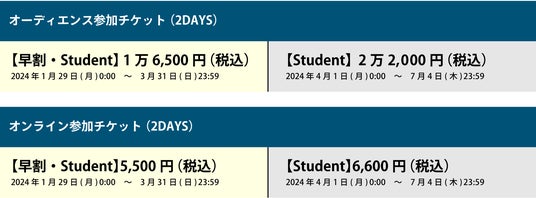 チケットはイベントサイトpeatixで購入可能です。Studentチケットは小学4年生から大学院生までが対象。11名以上の団体チケットも各種対応可能です。