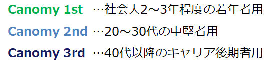 キャリア自律とは個別性が高く、中長期に渡り成熟させていくものです。若年時からキャリア自律を学び、習慣形成することが理想と言われています。一方で業務経験や転機の遭遇有無など、人によってキャリアステージや発達課題は異なります。Canomyは対象者のキャリアステージに合わせたゴールを設定した3種のプログラムを提供します。
