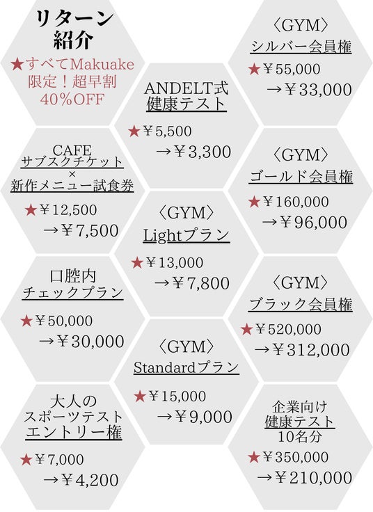 最先端健康施設の、Makuakeでしか手に入らない最先端健康施設の特別なプランを、なんと40%OFFで皆様にお届けします! 通常提供していない特別なサービスもご用意しましたので、一足早くぜひ体験してみてください!