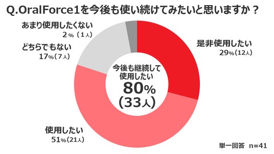 また、回答者の80%が「OralForce1」をこれからも使い続けたいと評価をしており自宅で手軽にできる口腔ケアの重要性と共に、その品質にも高い信頼が寄せられていることがわかりました。