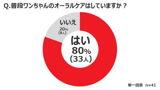 そのうちの8割(80%)の医師が普段から自宅で愛犬にオーラルケアをしていると回答をしており、約2割(20%)の医師がオーラルケアは必要だと感じながらも実際にはしていないという結果となりました。