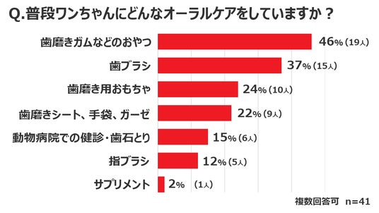 現在ワンちゃんのためのオーラルケア商品は様々な種類の商品が発売されています。アンケートに回答した犬を飼う医師の4割(46%)の医師が与えるだけでオーラルケアが簡単にできる「歯磨きガムなどのおやつ」を利用している方が多いのがわかりました。飼い主や愛犬にとっても負担が最小限に減らせることが理由の一つとして挙げられます。