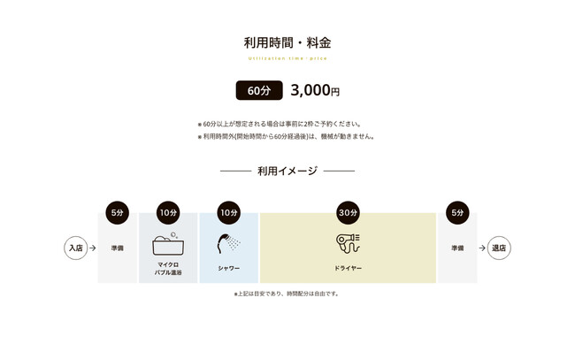 時間内に入浴からドライヤー、帰宅前に簡単な清掃をお願いしており、時間が過ぎると空調、照明以外の機械は制御されます。利用料金は60分3000円。2枠連続して予約することも可能です。