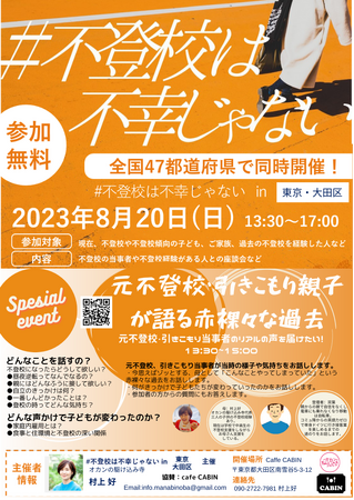 (発起人:小幡和輝)は2018年に発足し、不登校のイメージを変えるムーブメントとして開催してきました。今年は4年ぶりに全国一斉にリアル開催されます。その中で、元不登校・引きこもり親子の貴重な体験をもとにした親子対談を8月20日(日)東京大田区南雪谷において行い、多くの方々に希望と勇気を提供します。